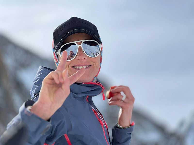 « Beau début de journée avec un accueil de l’équipe juste au top. Un début en station pour se mettre en jambe. Une belle figure artistique de notre chère médecin nutritionniste qui a mis un petit coup au moral de l’équipe. Une petite randonnée en fin de journée dans un milieu juste magique mais avec une descente un peu compliquée émotionnellement pour moi au milieu des glaçons comme dirait nos guides et de la neige polente… »